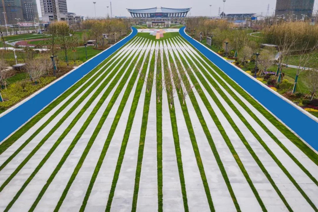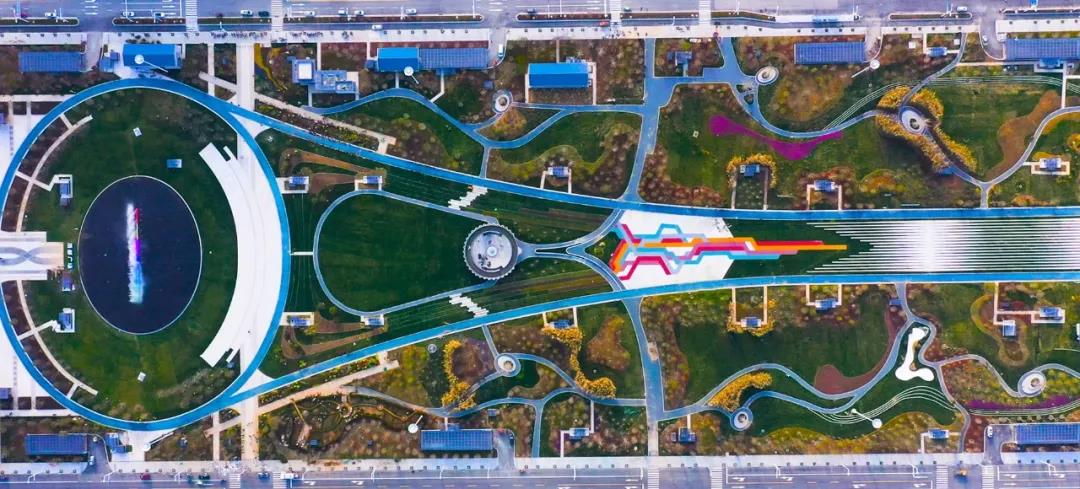 蓝天白云之下,市高铁商务区酒都广场的彩色沥青蹊径与绿化景观相得益彰、、、浑然一体。